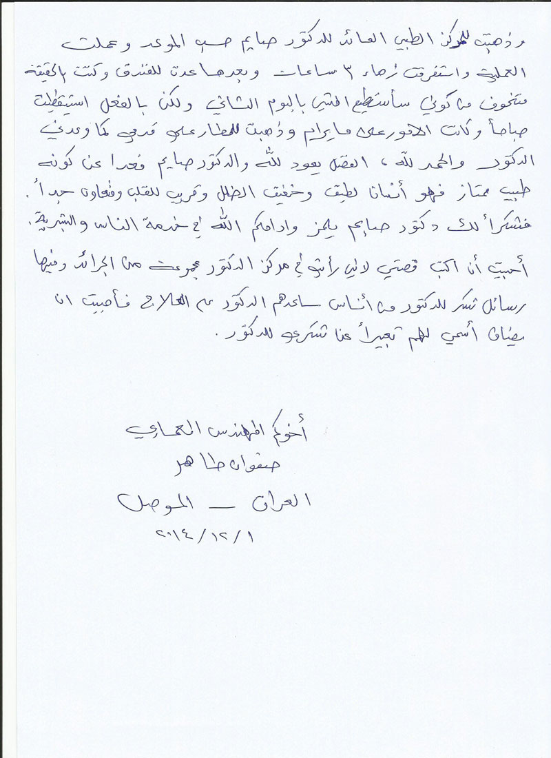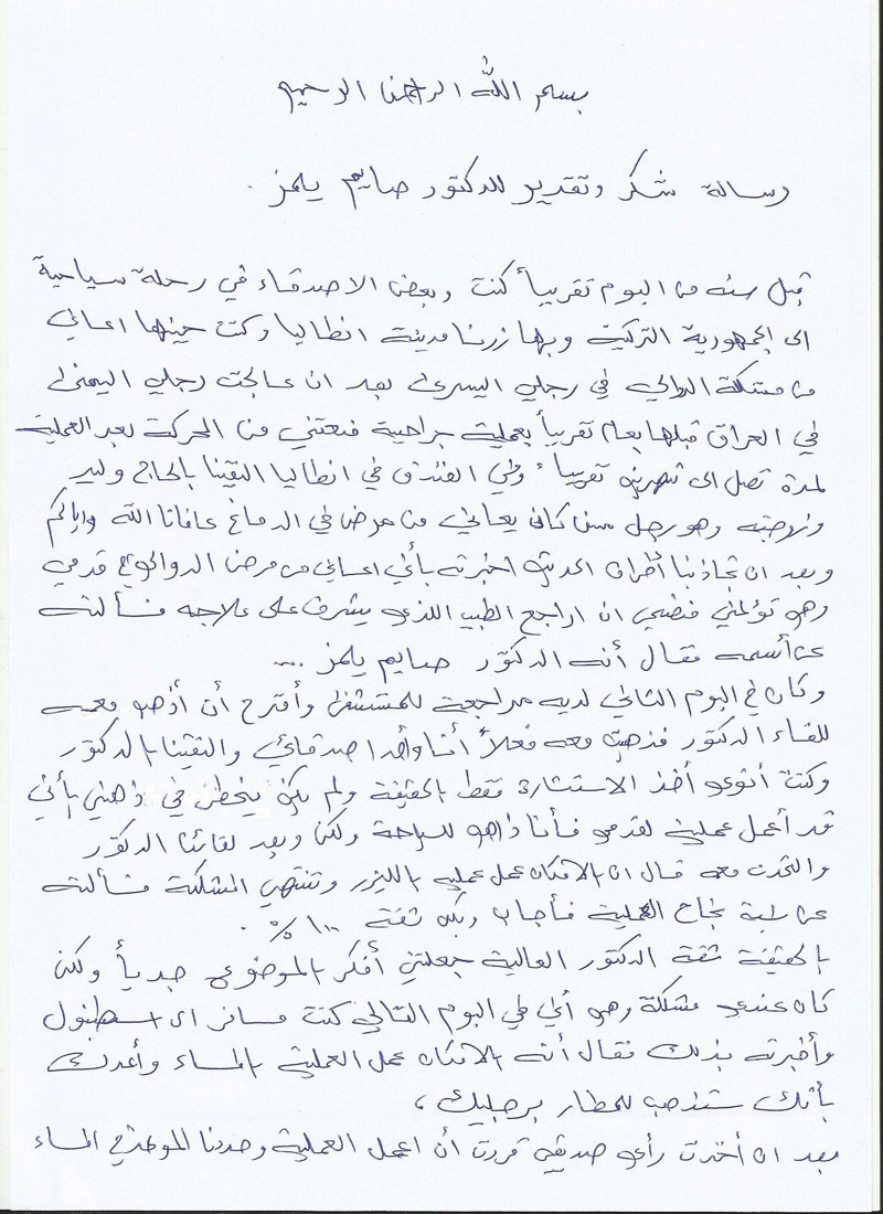 Biz bir yıl once arkadaşlarımla tatil için Irak’tan Türkiye ye geldik ve Antalya yı ziyaret ettik .Ben varis hastasıydım bır yıl once Irak te sağ bacağımdan varis ameliyaı olmuştum. Ancak ameliyattan sonra 2 aydır yürümekte zorluk çekiyordum. ve amaliyetten sonra yaklaşık 2 aydır yürüyemiyordum .Sol bacağımda ameliyata rağmen iyileşmeyen varisler çok acı çektiriyordu bana. Antalya’da kaldığımız otelde Prof Saim Bey den yenilikçi metodlarla kanser tedavisi gören bir Libyalı ile tanıştım. Saim Hoca kendisine intraarterial kemoterapi diye yeni bir kanser tedavisi uyguluyordu. Prof Saim Bey’in kanser tedavisinin yanında lazer ile varis tedavisi de yaptığını bilen Libyalı arkadaşım Saim Hoca hakkında övgü dolu sözler söyledi ve bana kendisini görmemi tavsiye etti. Ben de sadece bilgi almak için bile olsa kendini ziyaret ettim.